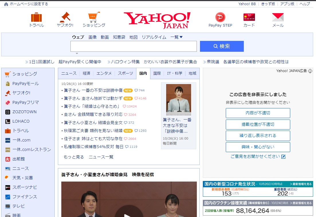 そんなホットなご時勢にあって、代表的ポータルサイト「Yahoo! JAPAN」のトップページのザマがコレ(画像は同日16時23分のスクリーンショット)。ニュースヘッドラインが羅列されるなか、「国内」をクリックしたとたん、もはや呆れ返ることすら忘れてしまったのであった。