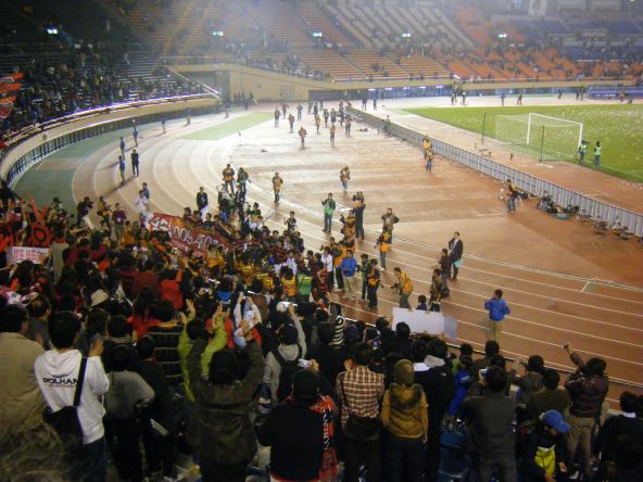 じつは、6月の渡韓時にたまたまテレビで浦項の試合をみて、その攻撃的サッカーにすっかり魅せられてしまい、ぜひじっくりと観戦してみたいと思っていたところに日本での試合、それもアジアクラブのトップを決するという大一番に巡り会ったのである。試合は両者ともに拮抗した実力をみせ、0ー0のまま後半に突入、浦項が得意とする力の攻めを巧みに阻まれる展開となったものの、後半12分に盧炳俊の直接FKで先制。21分には金亨鎰のヘディングシュートで追加点を挙げるなど、2ー1で初の栄冠を掴んだ。